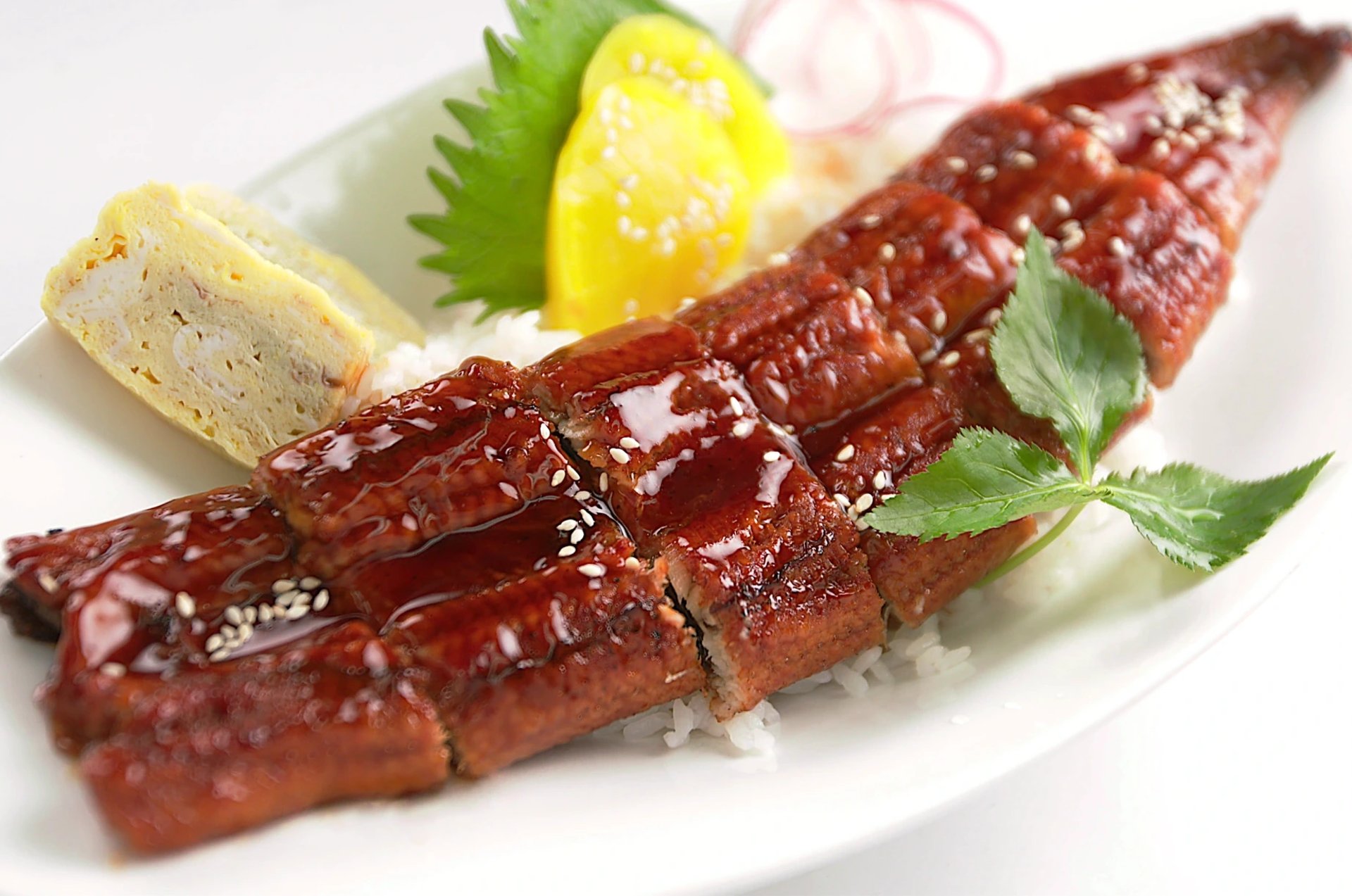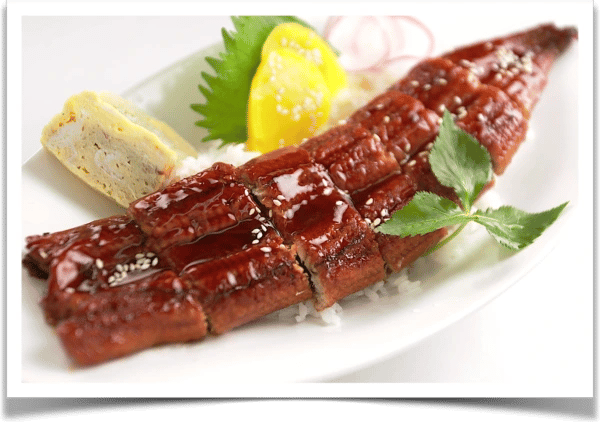 Broiled Eel Glazed With Sweetened Soy Sauce On A Bed Of Rice, Served with Japanese Omlet and Pickles
