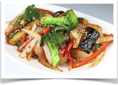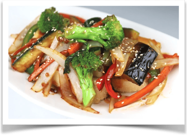 Flash Fried Tofu With Sautéed Vegetables in a Vegetarian Sauce, Finished with Sasame Seeds.
