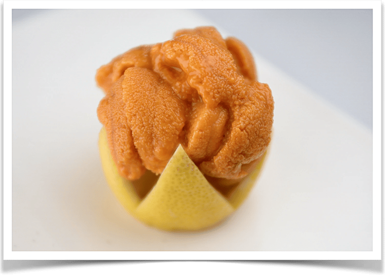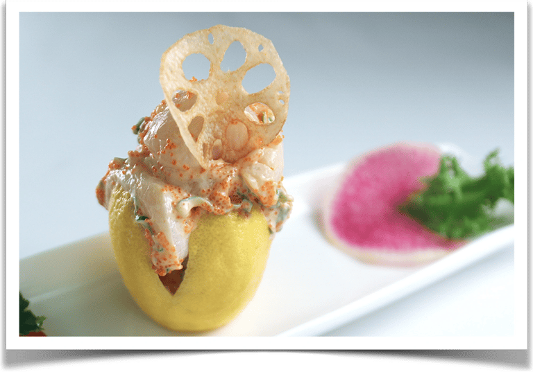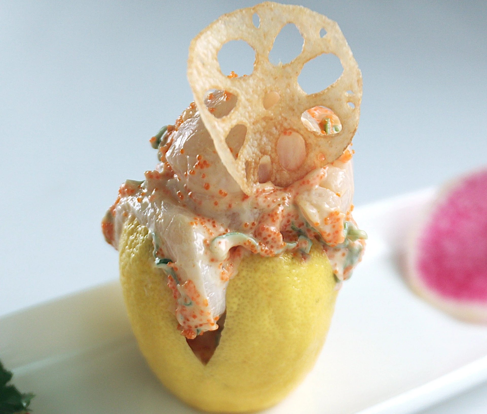 A Combination of Scallop Sashimi with Japanese Mayonnaise, Tobiko, Green Onion, and Lemon, Garnished with a Slice of Turmeric