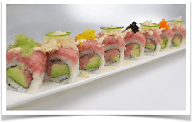 Slices of the fatty, most valuable portion of a tuna, placed on a california roll.