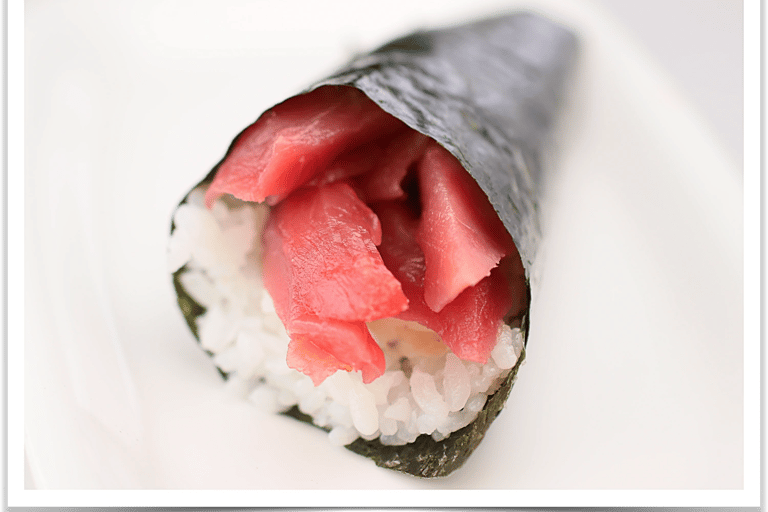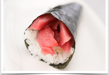 Slices from the fatty, most valuable portion of the tuna, places in a cone-shaped roll of rice and nori.