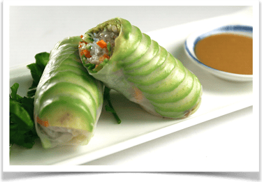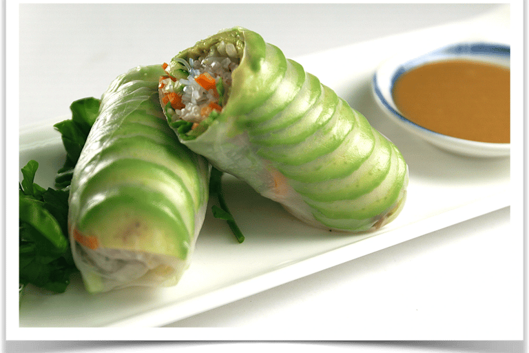 A Light Roll with Rice Noodles and Vegetables Covered in Avocado Slices and Wrapped in Rice Paper.