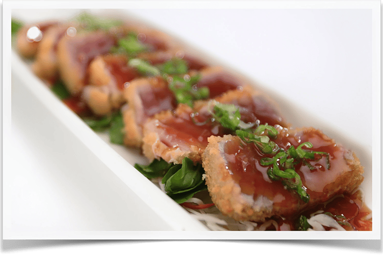 Slices of tuna, breaded in Japanese panko, and flash fried.