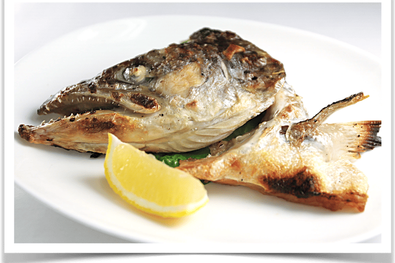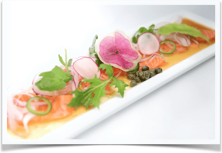 Slices of Salmon in a Tangy Lemon, and Oil & Vinegar Dressing. Garnished with Capers, Red Onion, Radish, Jalapeño, and Salad Greens.